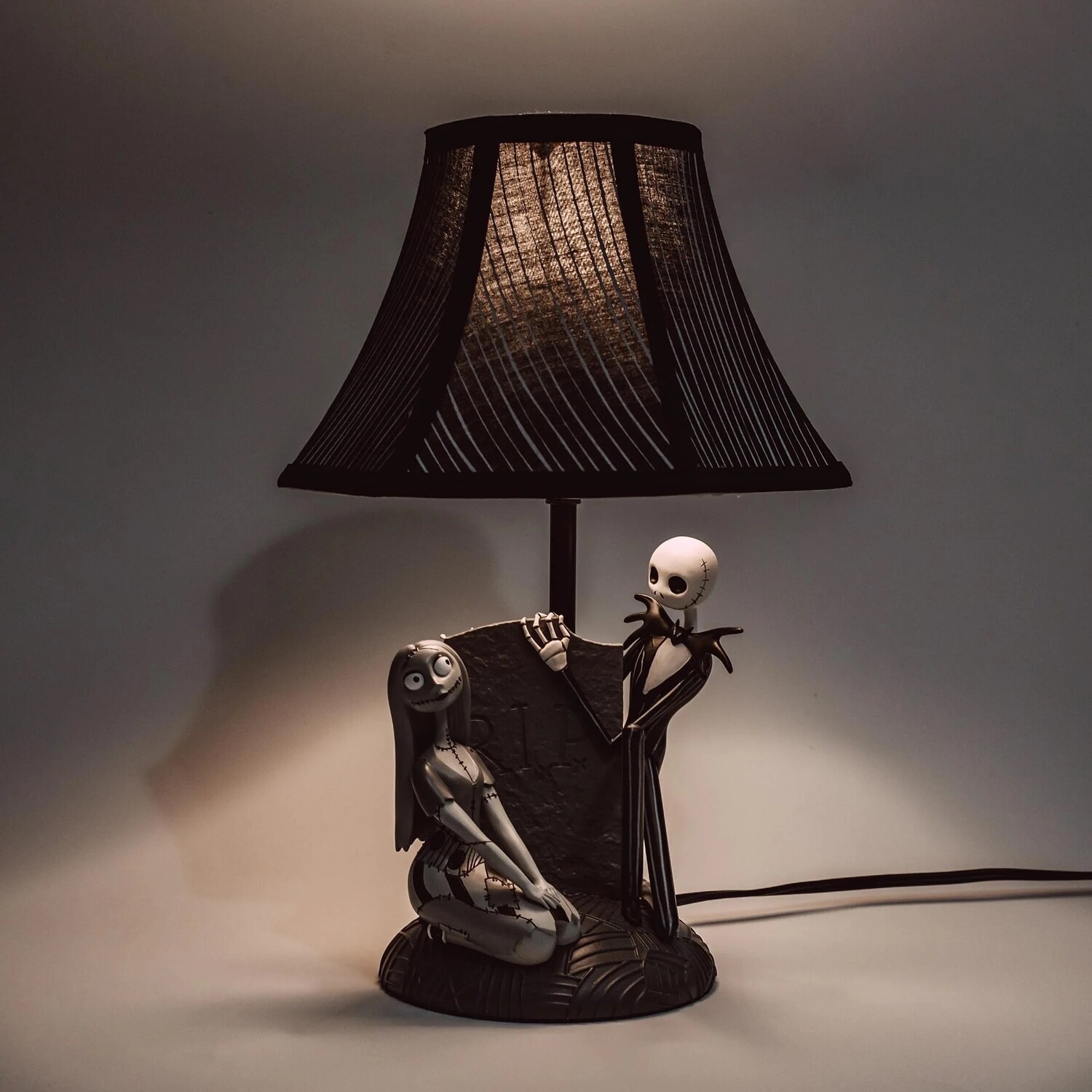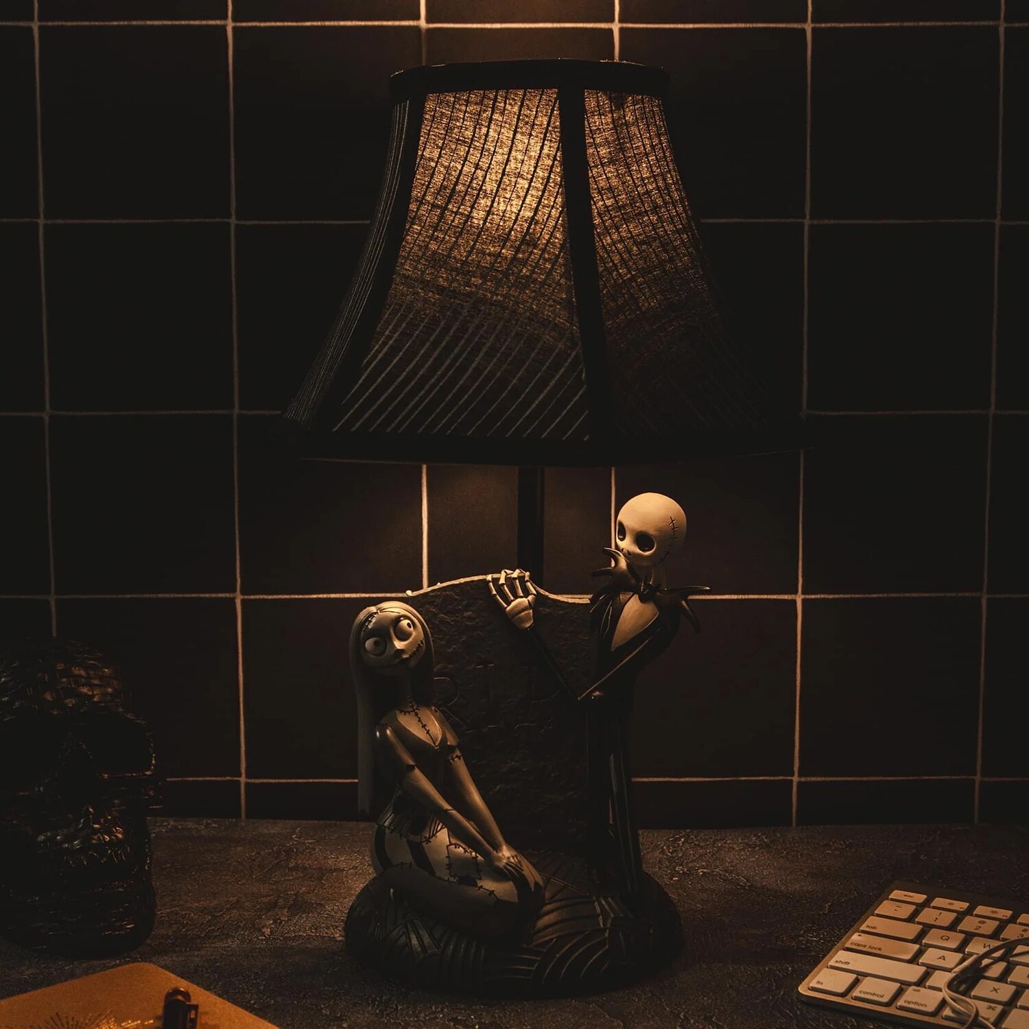 Jack Skellington and Sally Table Lamp captures the dark romance of Tim Burton’s The Nightmare Before Christmas. Standing approximately 15 inches tall, this sculpted polystone lamp depicts Jack and Sally in Halloween Town’s graveyard beneath a black-and-white striped fabric shade. Equal parts eerie and elegant, it’s a perfect accent for fans who want to bring a little spooky magic into their space.